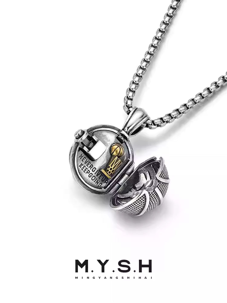 A basketball frozen in silver, just as it’s about to leave the hand. The curves are playful, but the weight is serious – the softness of a game turned into a small metal planet you wear every day. It’s the echo of street courts at night, of sneakers on concrete, of that one perfect shot that never quite leaves your memory. It carries the spirit of “play” into a life that may no longer have time to play, letting you keep a private piece of the court under your jacket.